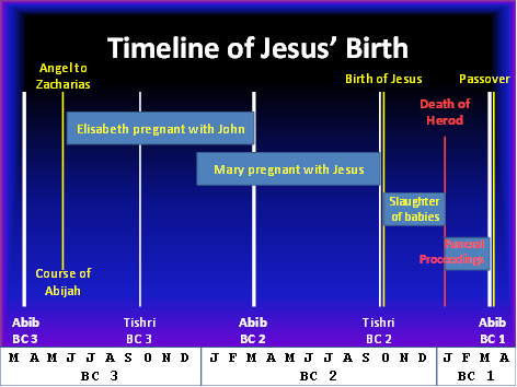 We now trace through the timeline of the birth of Jesus and we begin by picking a year when Jesus was a baby when Herod had all the male babies slaughtered we start at 1 Abib, BC 3, which falls on a Monday, 18th March.